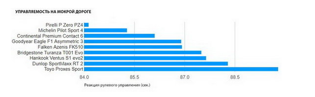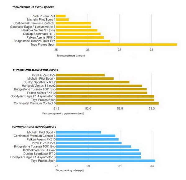 Безусловную победу в этом "соревновании" флагманских автошин одержала модель Michelin Pilot Sport 4, недавно поступившая в продажу. Изделие продемонстрировало впечатляющие показатели в дождевых условиях. Эта шина превзошла конкурентов и по управляемости на сухих и мокрых покрытиях. Второе место досталось автошине Pirelli P Zero PZ4. Несмотря на то, что модель не сравнилась с покрышками Мишелин по управляемости и балансу, она оказалась самой быстрой на сухом и мокром асфальте. В первую очередь это обусловлено низкой сопротивляемостью качению. Но результаты испытаний при повороте на мокрой дороге оказались неутешительными - по этому критерию шина отстала от лидера почти на 20%.